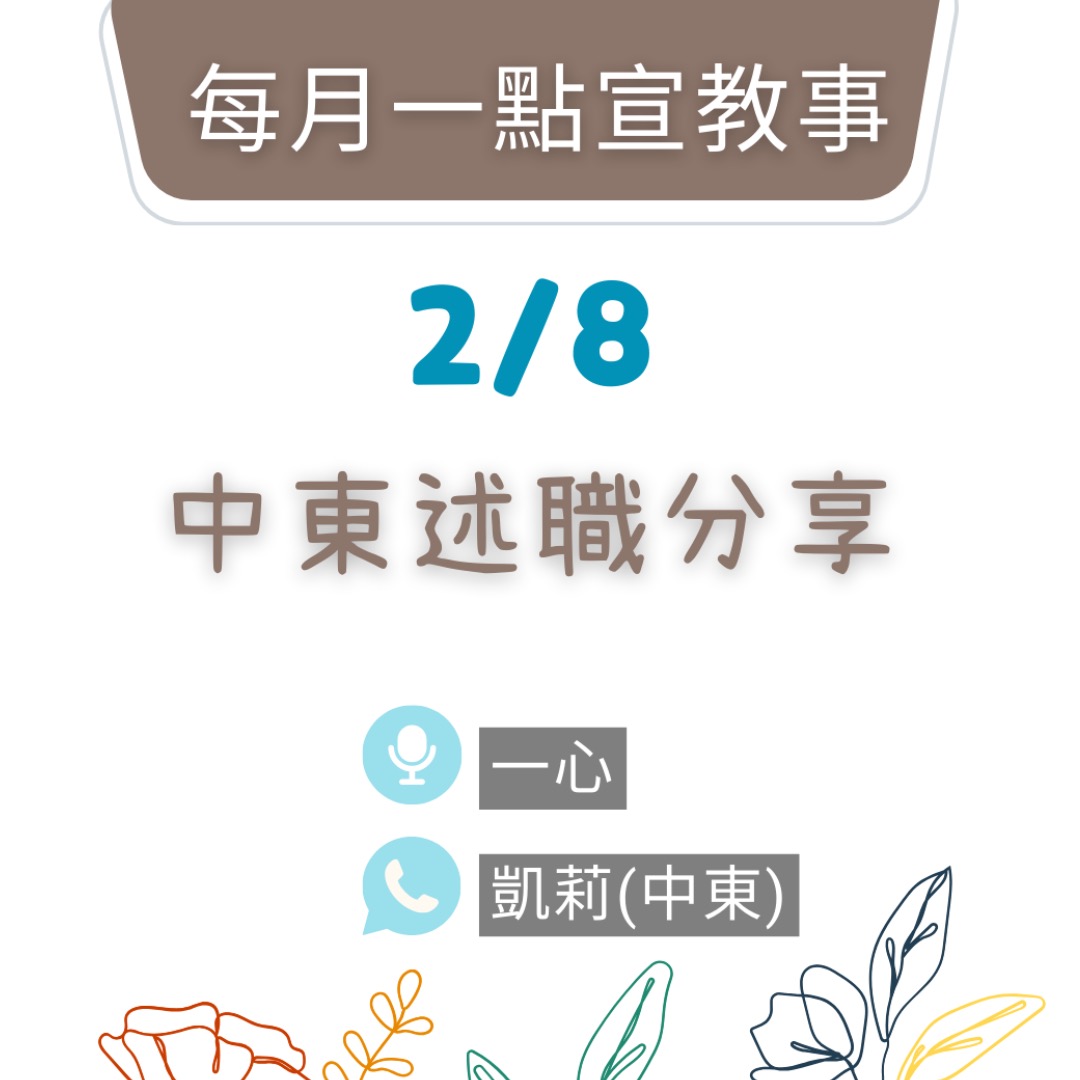 2026每月一點宣教事 第一季 日期:1/11(日) 專題:Yuri的宣教路:從日本到南亞的旅程 講員:Yuri 連線工人:阿奇&可兒(中亞) 立刻報名 日期:2/8(日) 專題:中東述職分享 講員:一心 連線工人:凱莉(中東) 立刻報名 日期:3/8(日) 專題:淑芬的宣教路 講員:高淑芬 連線工人:小鋼&巧飛(中東) 立刻報名